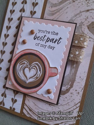 Hey ladies! I was so tickled when I open my last delivery and got a good look at the new Online Exclusive bundle called Latte Love. Oh, my goodness. The set is so darn cute, and the DSP is really gorgeous with it. I'm really excited about this whole suite. It could be changed up to make a cup of hot chocolate or tea instead of coffee. Whatever you prefer. It all coordinates so well that it will be a real treat to create with this! I already made a couple of cards with the set, well mostly the DSP. Today will be the simpler card, and tomorrow's post will be the fun fold. And then who knows what will be next.