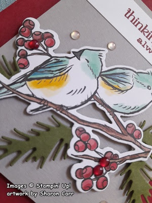 Today I have a card for you that started out as one of the make & take projects Stampin' Up! had for this new stamp collection, Winterly Tree Tops. It will be available in the new Mini Catalog that will be coming out soon. I have to admit I really didn't care for the project - it just wasn't me. Everyone has their own tastes in favorite color combos and design layouts, etc. This project simply wasn't a favorite for me. So, I took some of the components that I already had cut to make the project and made my own project instead. This one might not be one of your favorites, but that doesn't mean you can't take parts of the card design and change them into something you prefer. Here's my take on the project. What will you make with this idea?