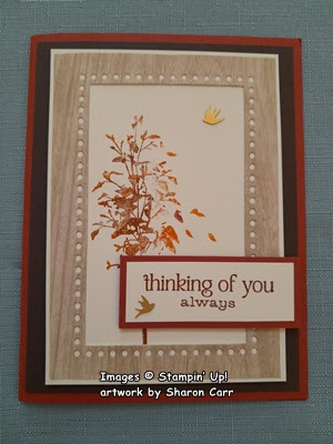 Hello friends! It's been wonderful weather that I'm enjoying to the max. But all those fall color changes will be coming soon, so I thought I would get a jump on it ahead of time. On yesterday's card, I used a piece of the Country Woods Designer Series Paper that I had die-cut. Today, the card uses the rest of the piece of DSP that framed the piece that was cut for yesterday. Sometimes my extra pieces sit around for days (or weeks) before I get around to utilizing them. I made sure to get this one used right away.